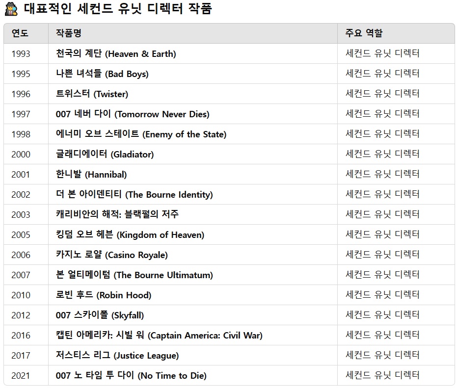 - 대형 블록버스터에서 세컨드 유닛 디렉터로 활약